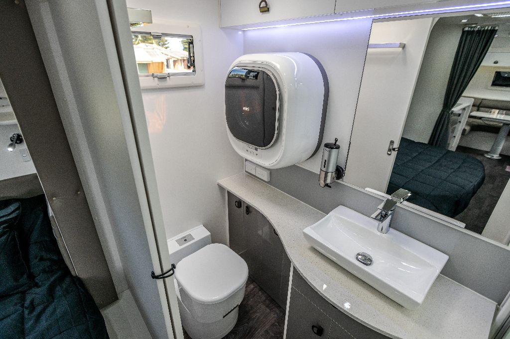You’re close to the ensuite, too, which, being as wide as the van, comes with goodies like the Daewoo washer that’s wall-mounted for ease.