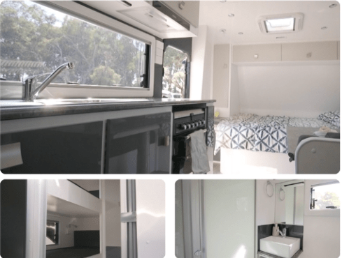 At the opposite end of the van are the bunks. Now this one came with triple bunks but twin bunks with extra storage are also available. They’re conveniently close to the rear corner bathroom amenities comprising a separate shower, toilet and sink.
