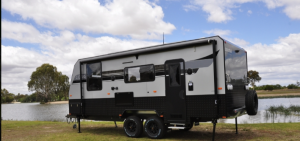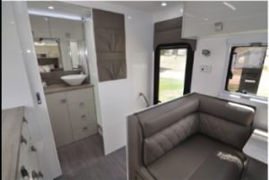 Internally the offerings include – premium vinyl flooring for easy maintenance, lift-up under-bed storage, recessed cook top with Laminex lid over stove, innerspring mattress – queen or single beds, positive locking European door latches with soft open gas struts, smooth glide drawers on metal runners, tri-fold café table or L-shaped lounge, plush upholstery with side swabs to dinette, separate shower & toilet ensuite with glass door shower, full height linen cupboard in ensuite, Perspex splash back & laminate bench tops, bed head padding, LED Strip Lighting, overhead cupboards in bedroom/ lounge kitchen/ensuite, wardrobe cut-outs with 240V plug.