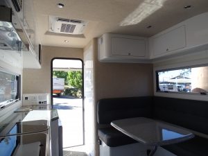 The entry door is in the back, with an awning over it. This actually adds a lot of usable internal room and you feel like you are coming in through a hallway. The kitchen is on the right-hand side and starts at the back wall and goes a bit over halfway down the wall with a curve in the bench over the fridge. It breaks the straight line up beautifully. On the left-hand side is the combo en-suite. It is not wide but wide enough and really quite long. I am not a combo fan, but this one looked pretty good and very usable.