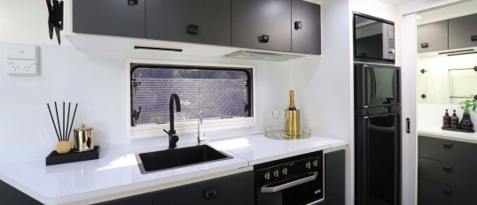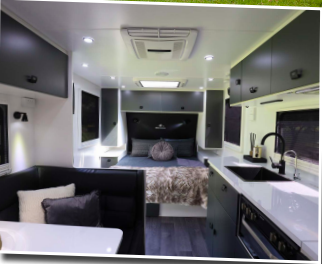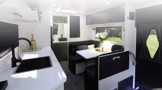 Design RV nestles the tanks within the chassis for clearance and stability, aided further by those 16in rims and Aussie made Alpha independent, coil sprung suspension with dual shocks dampening at each wheel. The rear-view camera bolsters driver safety. All up, a great little package.