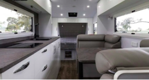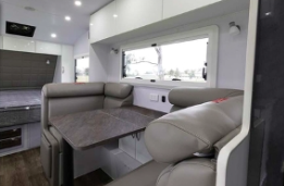The flagship Suit of Armour 1960 RD is a brightly lit luxury off-grid electric caravan with leather upholstery and high gloss benchtops and cabinets contrasting with matt black kitchen fittings. It has a long practical benchtop with a deep sink and drainer next to the safe two-hob induction cooktop. What lifts this luxury 4×4 electric caravan layout is the leather dinette. It’s high-quality, featuring leg rests and headrests across the back and side with no fussy panelling.