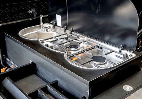 A nifty drop-down picnic table nearby is the perfect spot for a second pair of hands to organise meals or dry the dishes.