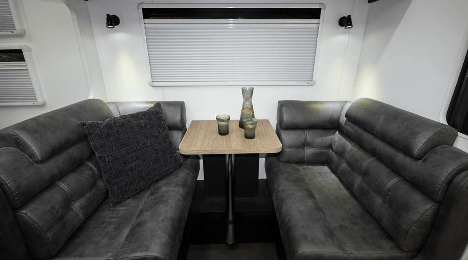 The styling continues indoors, with the rear entry accommodating couches at the tri-fold table complete with neck- and footrests for relaxing at day’s end. It’s calmly lit with tapered wall lamp lights complementing the ceiling LEDs.