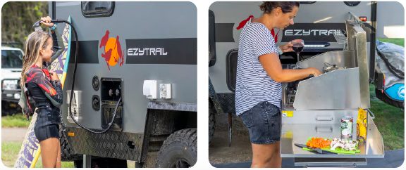 The Robe gives plenty outdoors, starting with Ezytrail’s popular slide out kitchen, parallel to that slide-out for a fridge. Four burners, a pantry, cutlery drawers, a sink and stacked drainage streamline mealtimes. While an a-frame mounted tap and external shower help keep your camp clean near storage for poles, gear and a genie. Outdoor speakers and bug lighting create a welcoming ambience beneath the electric awning for longer in this fully-enclosable space.