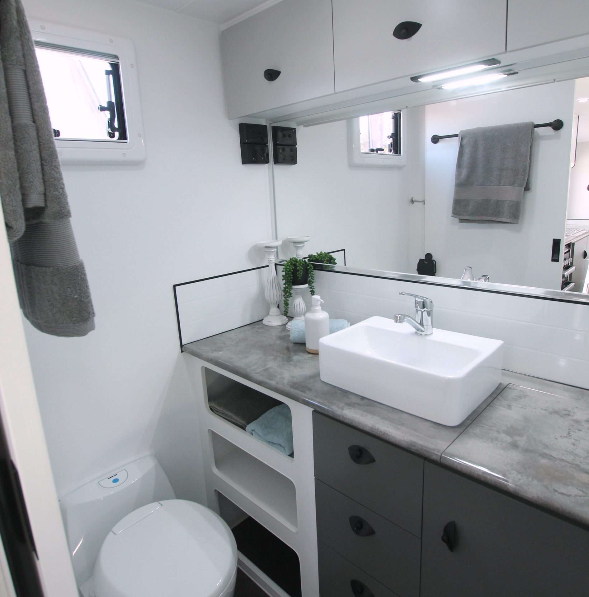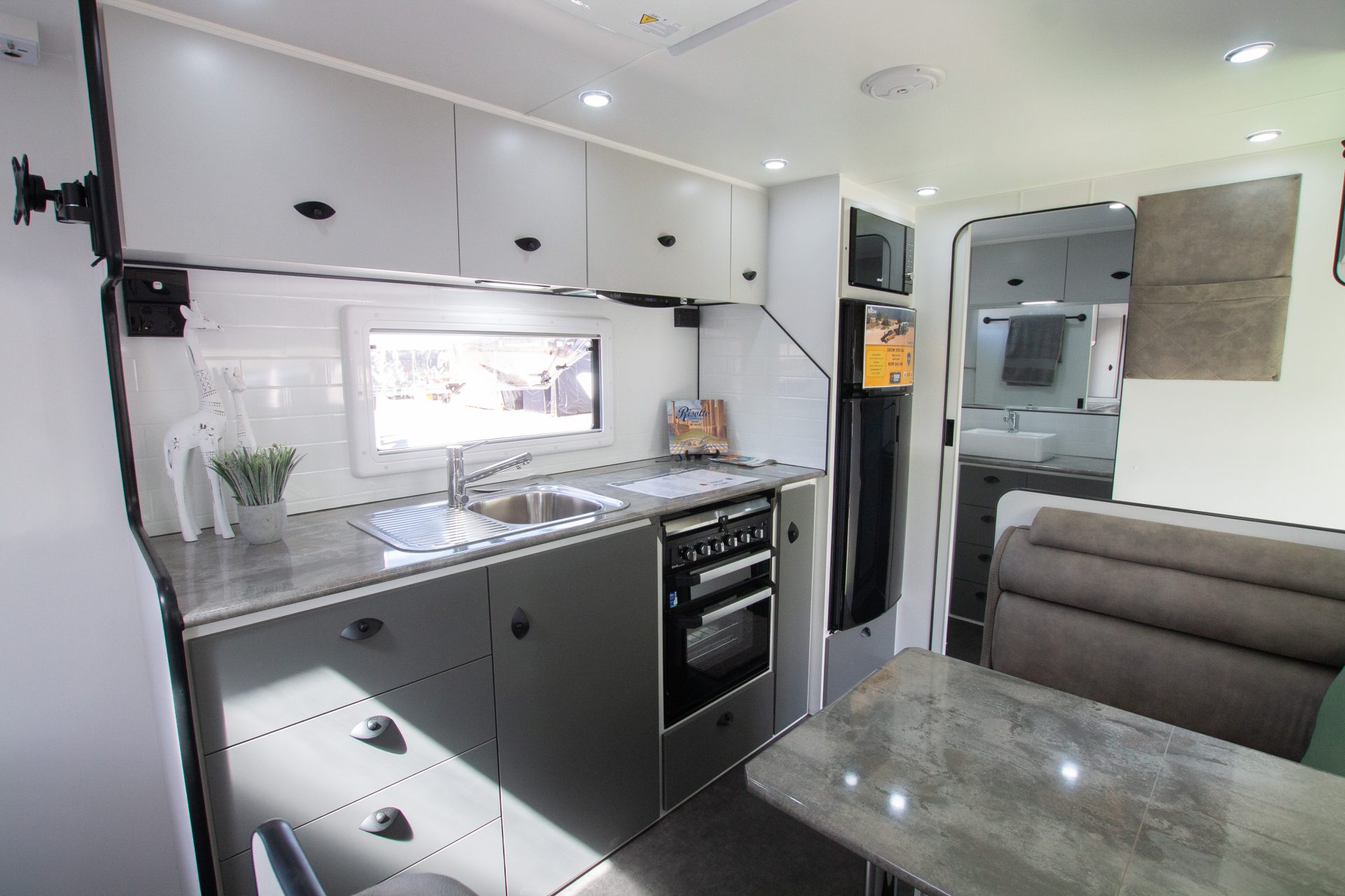 Featuring a front island queen bed, cafe dinette and kitchen adjacent and a full rear ensuite–it is easy to tow with more vehicles thanks to a starting Tare weight of 2.4T and a 3.2 to 3.5T ATM, depending on options.