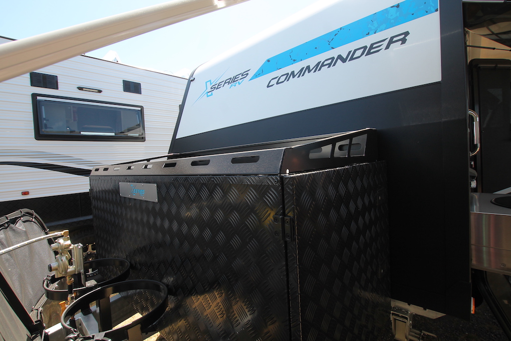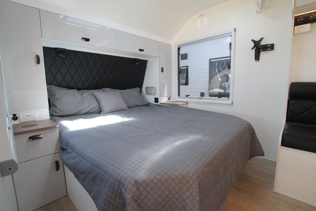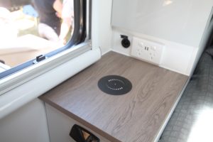 A REDARC power system comprising in 300Ah lithium batteries and 400W in solar; diesel heating; 190L of freshwater storage and 125L for grey; twin gas bottles and twin jerry can holders will campers happy off-grid for extended periods.