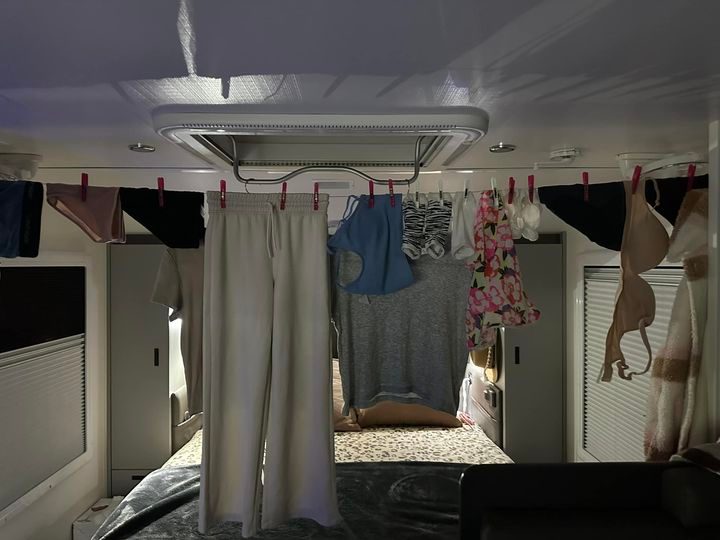 $10ish retractable clothes line off eBay, diesel heater on for the night and by the morning whilst driving to your next destination in the sun – dry.