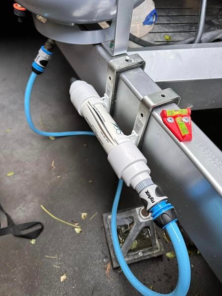 Russell posted: I wanted the inline water filter off the ground but not permanently attached to the drawbar. I fashioned some steel angle brackets with high density foam to attach the clips to. These brackets slip snugly over the drawbar and are easily removed. They can also be slipped over the rear bumper.