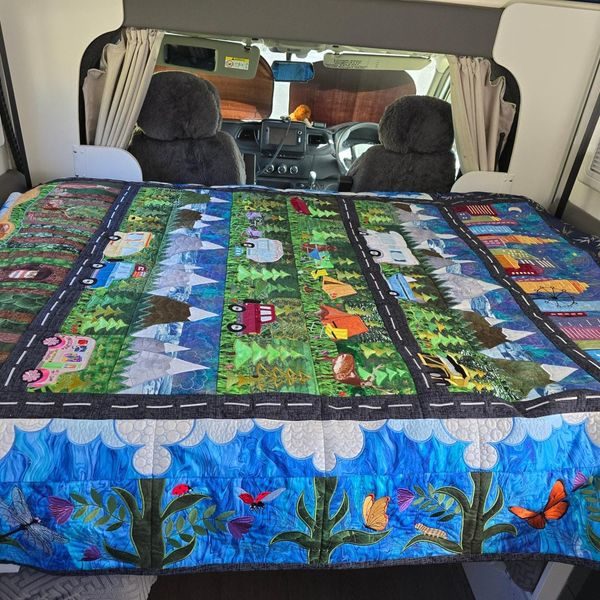 Leslea posted: I have made a custom fitted quilt for our Daintree. All applique and machine embroidery. Shaped to fit with the bed raising and lowering, avoiding the cupboards. It tucks under at the mattress foot.