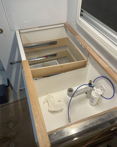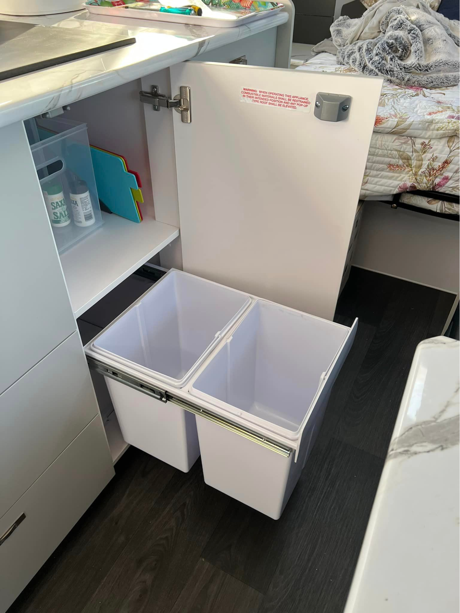 Jeff posted: Little job this afternoon, after seeing these in Carolyn’s urban at Pialba caravan park we had to steal the idea. Great addition. 2x rubbish bins installed. $100 from Bunnings. Just a little mod to the bottom of the cupboard to make them fit as the cupboard doesn’t have a floor.