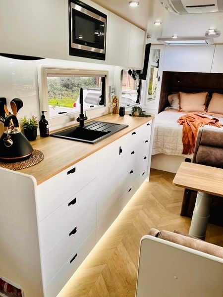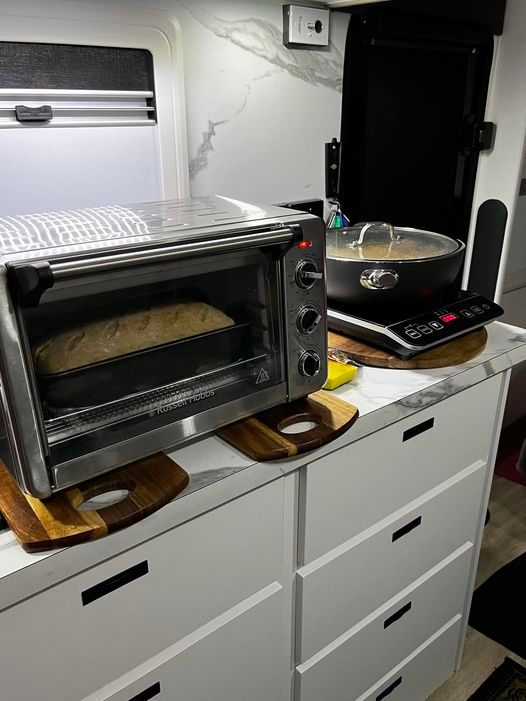 Sally posted photos of their new van. Question was asked – where’s the stove? The induction cook top is in the top drawer, leaving so much clear bench space. That’s today’s caravanning.