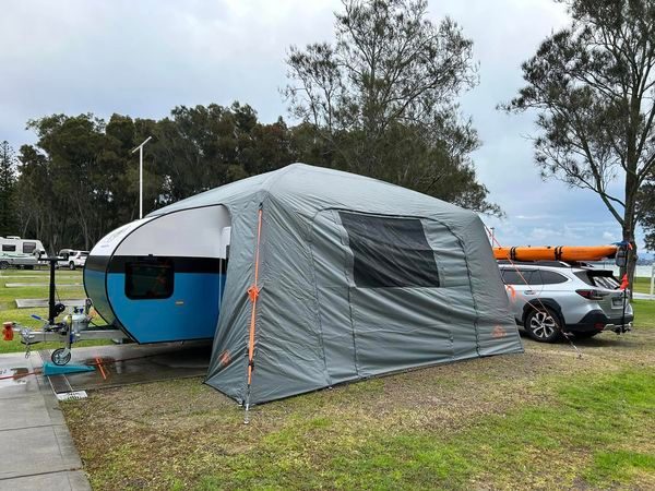 Gail shared a photo of her Teardrop Caravan in it’s tent. Why the tent, it gives them somewhere to sit outside the van, some privacy and it’s great in the wet. What a great idea.