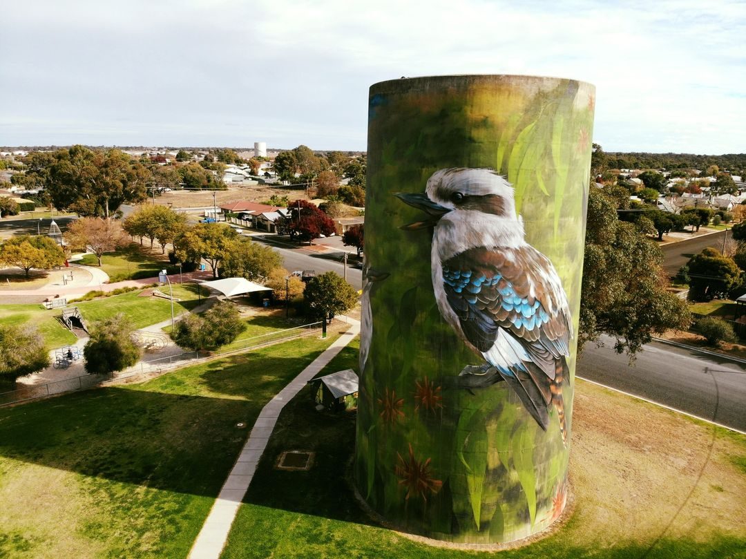 Experience the magic of Deniliquin’s Water Tower transformed into a masterpiece by renowned artist Cam Scale. Completed in just 17 days in July 2019, this mural tells a charming story of childhood memories and the beauty of the Australian countryside.