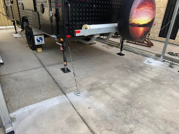 Steve posted: “Cyclone Alfred ready (I hope) my idea of securing the van. Filled water tanks, legs down, wheels chocked, chains on. Blow away now ya bugger!”
