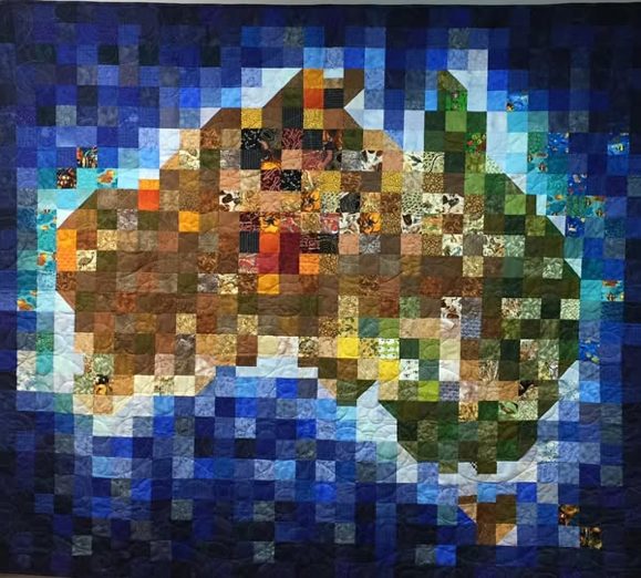 Jill posted “This is a king sized quilt I designed and made after collecting fabrics on a trip around Australia, I bought fabrics representing things I saw at the time: