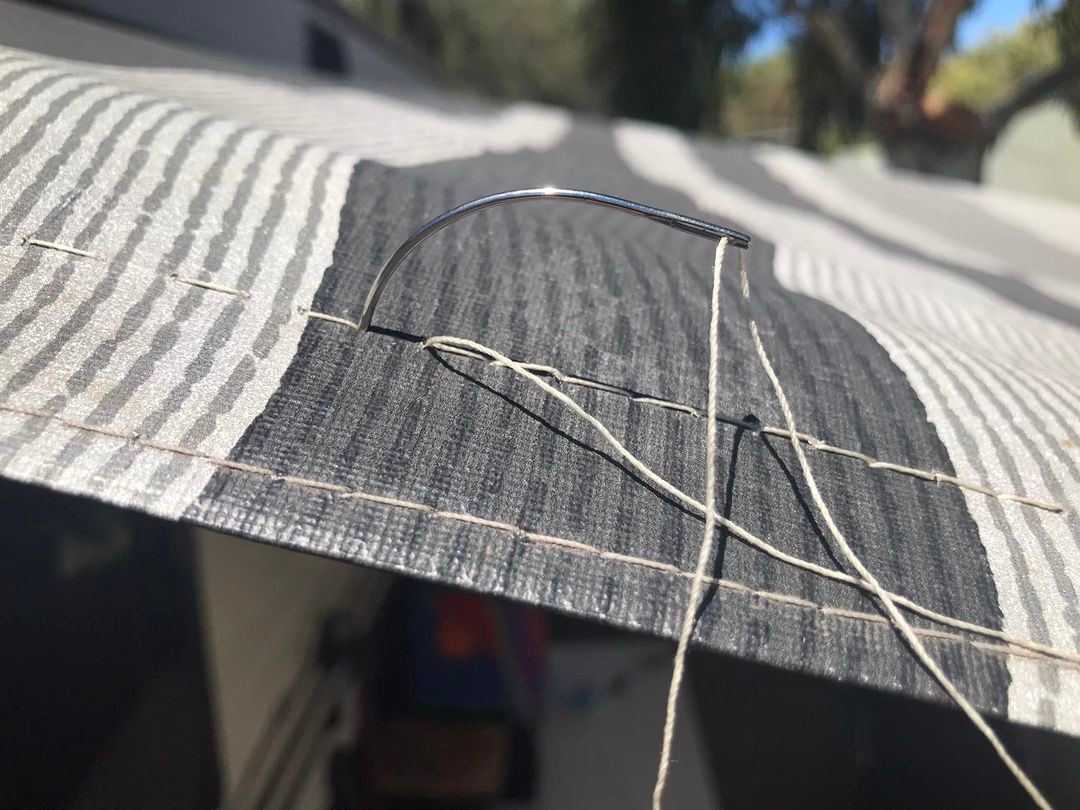 Kate posted: Stitching on awning. Thought I would share this. I’m sure others have experienced the stitching on their awning perishing through UV or rotting. It’s taking a while but restitching the bad spots using existing needle holes. Easy to do but takes time – especially in the WA heat. Using a curved upholstery needle and Guturmann thread (from Spotlight). Satisfying result. (Someone also suggested dental floss as the thread)