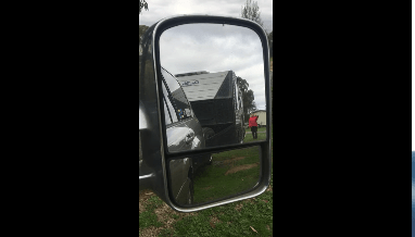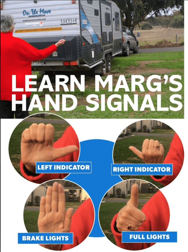 As Bruce sits in the driver’s seat, he watches in the side mirror for the signals Marg makes. As you can see in the video, it’s a matter of seconds to indicate the direction of the right blinker, left blinker, a stop sign for stop lights and thumbs up for full lights. Remember, too, with your mirrors, you need to be able to clearly see each other.