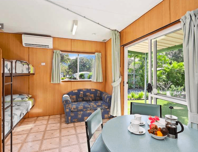 The large, flat grassy campsites are beautifully-shaded, with drive-through sites available. Pets are welcome at camp or in the pet-friendly cabin; advise at booking. There’s a games room, fishing, a grassy barbecue area, a coffee van in peak season, a camp kitchen, a laundry and a dump point.
