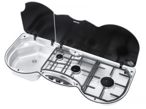 The new Thetford 353 combination unit combines a 7.5L sink with three different sized gas burners, making this modern looking unit the perfect space saver for both inside the RV or as an external slide out kitchen. The split glass lid (with built in safety shut off lid) offers both a clean look and extra work space. The domestic sized knobs and big gas burners make cooking in your RV just as easy and simple as at home. Moreover, Thetford’s 353 Combo unit is super easy to clean, as it is made of stainless steel and has removable cast iron pan rests.