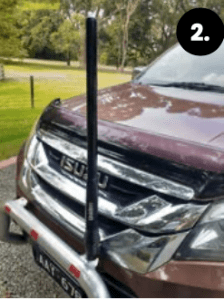 Aerial number two is the new Uniden AWX970S. With the assistance of Stephen Brown of Toffolon Motors at Seaford in Melbourne we replaced aerial number one with this one. It has a whip length of 570mm. Reception/ transmission was much better and a distance of up to 6-kilometres was achieved.
