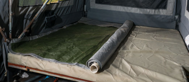 If you own either a hard or soft floor camper trailer protection the tents floor ends up on top of the bed when it’s packed away. Obviously it makes sense to clean the floor before you fold it over, but for an extra barrier of protection it’s time to make yourself a DIY bed protector. A cheap option is to simply throw a tarp over the bed, and for a few bucks you can grab yourself a bit of PVCpipe or even a length of timber. This will help you roll the tarp up with ease! Simply secure it to the pipe using a few self tapping screws through the tarps eyelets and you’re done!