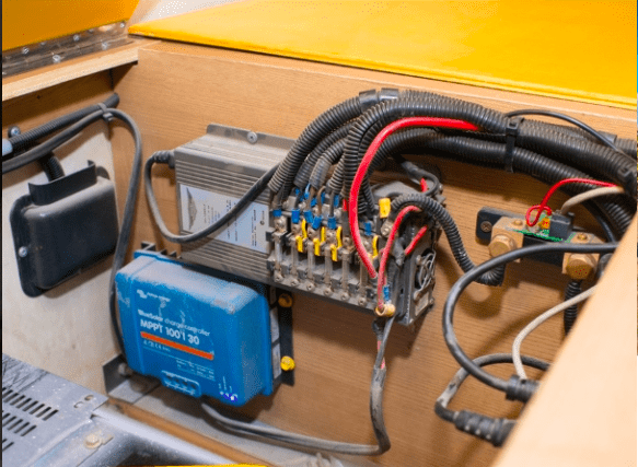 hood of the electrical box, you really want to see a nice and neat wiring installation with fused circuits. Everything should be mounted securely, including the batteries. If any of the wiring shows signs of getting hot, like dark marks on the insulation it’s a cause for concern. Like wise for random exposed wires and dodgy looking connections and the owner in the background saying, “I had fun learning how to do electrical”.